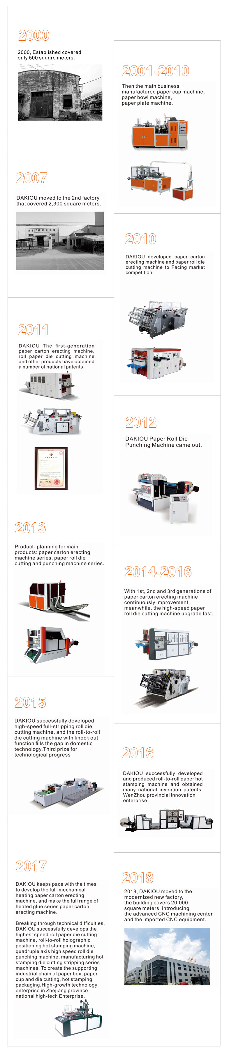 中國·瑞安市大橋包裝機械有限公司成立于2002年,是一家集科研、制造、銷售及服務為一體的高新技術企業(yè)。公司專業(yè)生產(chǎn)全清廢卷筒平壓平模切機、高速卷筒平壓平模切機、全自動立體紙盒成型機(上膠和熱粘) 、紙杯(碗)機、紙盤機等紙容器自動化設備。自成立以來,公司不斷深化產(chǎn)品生產(chǎn)線,對產(chǎn)品精益求精,取得數(shù)十項發(fā)明和實用新型專利,全面通過歐盟CE質量安全認證。榮獲得省市科技(創(chuàng)新)型企業(yè),國家高新技術企業(yè)。